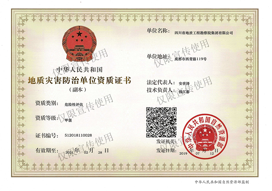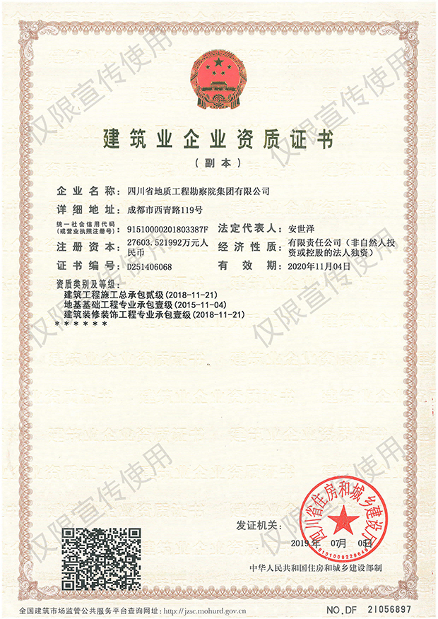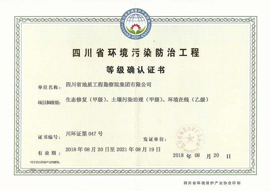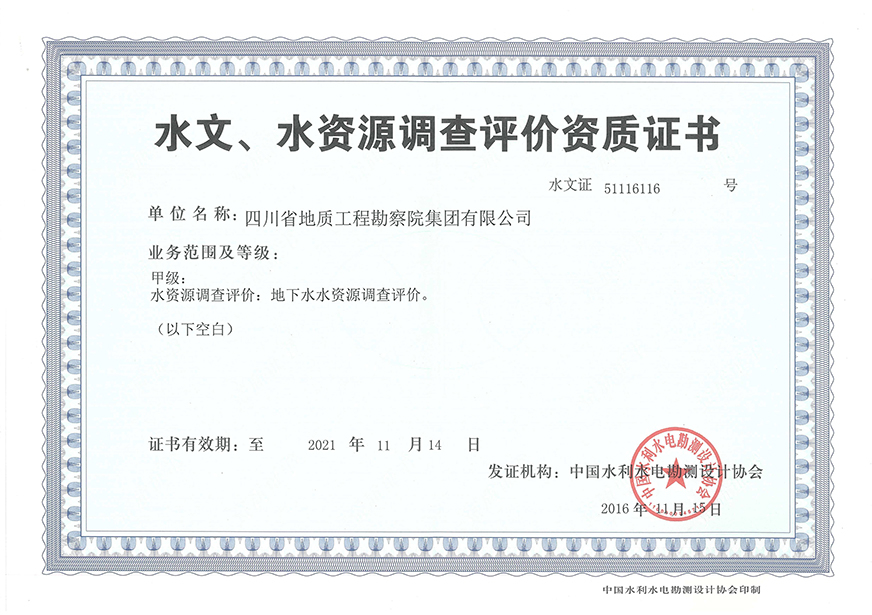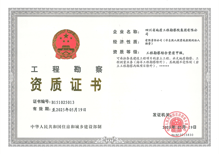 川勘集團擁有工程勘察綜合類,地質勘查,測繪,地質災害評估和治理工程勘查設計、施工、監理,城鄉規劃編制,水利行業設計,環境工程專業設計,水利水電工程、建筑工程、市政公用工程、公路工程施工總承包,地基基礎工程、建筑裝修裝飾工程、環保工程專業承包,檢驗檢測機構(CMA),水資源論證,水文與水資源調查評價,土地規劃機構,四川省環境污染防治工程等級評價、地震安全評價等甲(壹)、乙(貳)級資質、行業認證30余項。