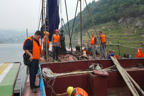 近日,水文地質工程公司承擔的萬州-云陽天然氣供氣管道工程彭溪河隧道穿越勘察任務已順利完成所有野外工作。水文地質工程公司首次在水深40米的河面上完成了水上深孔的鉆探施工,積累了豐富的經驗。