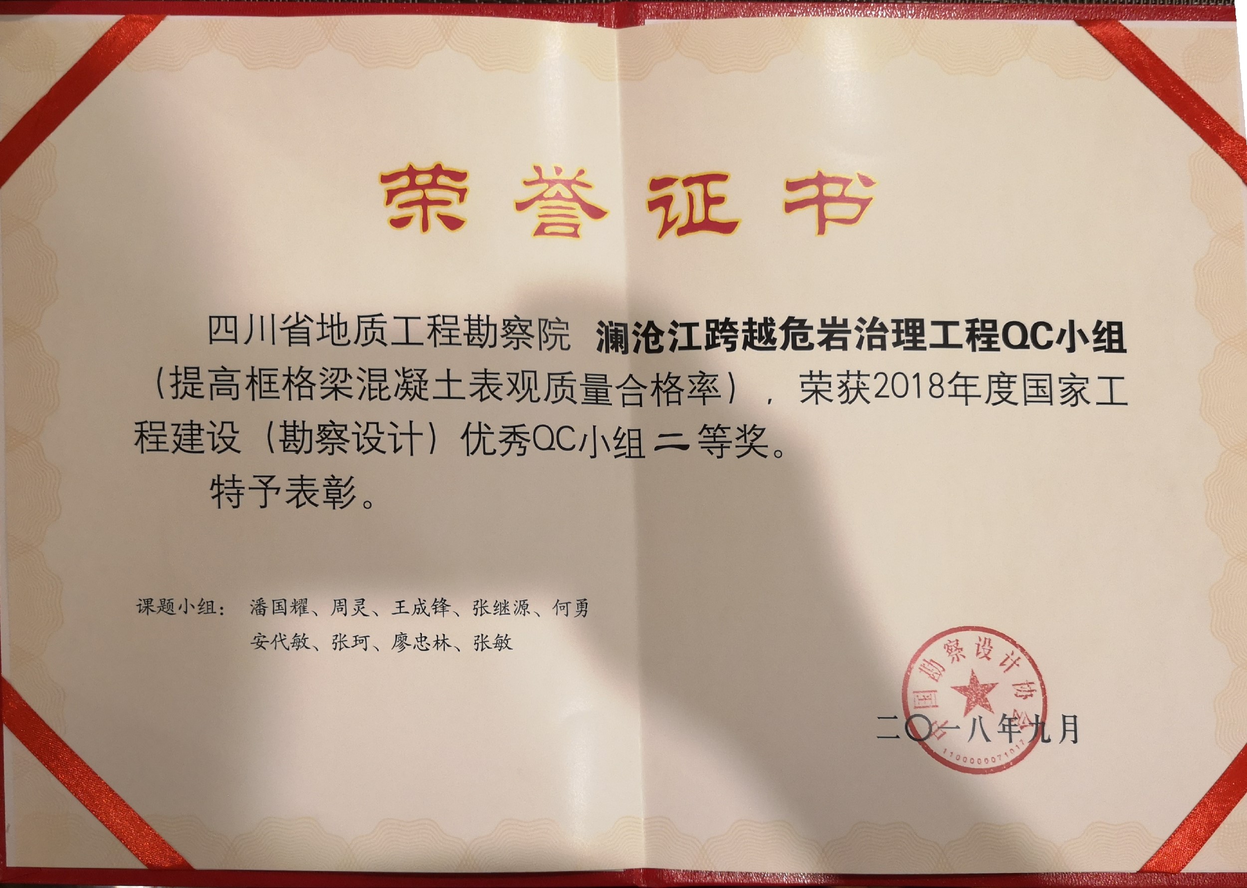 近日,我院瀾滄江跨越危巖治理QC小組在2018年度國家工程建設(勘察設計)優秀質量管理(QC)小組評選會上榮膺二等獎。這是繼2004年我院“資陽市雁江區紅層找水打井項目”榮獲QC一等獎之后時隔十五年獲得的第二個國家級QC獎項。